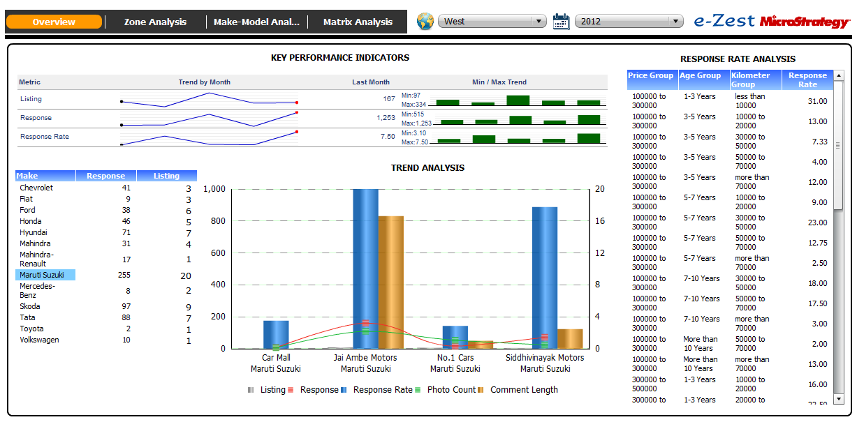 This Dashboard built using, MicroStrategy; is to measure automobile dealer performance. Trend Analysis allows you to measure dealer’s performance and can help in suggesting improvement areas. Zonal and Make/Model Analysis allows you to identify your strong and weak areas.
