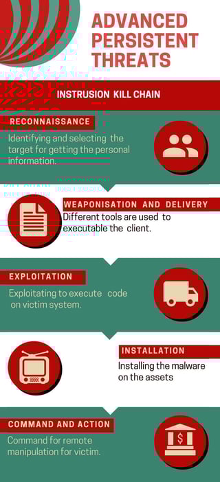 This infographic gives out a detailed picture about advanced persistent threats for organizations such as reconnaissance, weaponization and delivery, exploitation, installation of malware, command for remote manipulation.