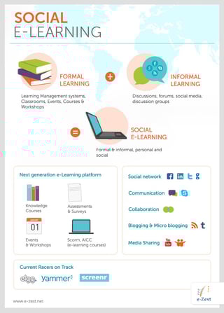 Social e-learning embodies characteristics of informal and formal learning, thus allowing a blend of personal and social qualities. Knowledge Courses, Assessments &Surveys, Events &Workshops, Scorm, AICC (e-learning course) are the next generation e-learning platforms on offer. The highlighting features of social e-Learning are Blogging and Micro-blogging, Media sharing, social network, communication, and Collaboration. Social networks like you Tube, Skype, Twitter, LinkedIn, Facebook etc. help to achieve higher levels of social e-learning, thus enhancing the overall process of social e-learning.